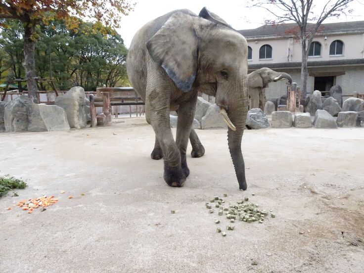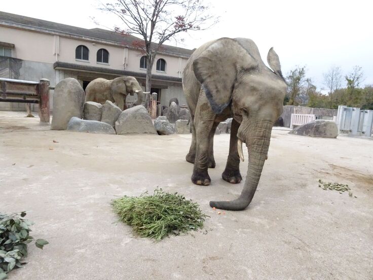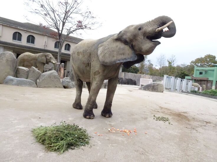 ゾウの鼻は、鼻と上唇が一緒に伸びたもので、中に骨はありません。人に利き手があるように、ゾウにも利き鼻のようなものがあります。メイは写真のように時計回りに鼻を回しますが、後ろに写っているサバンナゾウのタカはメイとは反対方向に回します。ご来園いただく機会があれば鼻の使い方にも注目してみてください。