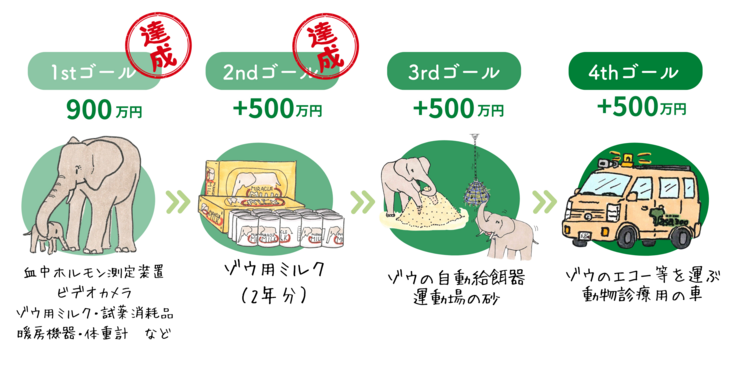 第3目標では、出産、子育てだけではなく、ゾウ達の生活の質向上のために、1,900万円を掲げて挑戦を続けてまいります。