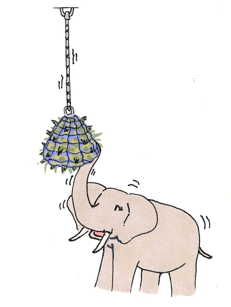安佐動物公園でも、できる限り採餌時間を延ばすために、給餌の回数を増やしたり、餌をさまざまな場所に置いたりしています。しかし、広さに限りのある飼育環境では、分散して餌を置いていてもゾウはすぐに取って食べることができますし、飼育担当者がゾウに給餌できる時間も一日の半分以下です。