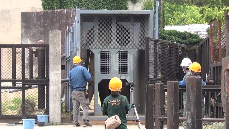 前日から秋吉台に伺って移動行程の最終確認を行い、2日は朝からダイを輸送用のクレートに入れる作業です。ゾウのサイズの生き物を麻酔で箱に入れることはできないので、ダイに自分から入ってもらう必要があります。この日に向けて、秋吉台のゾウ担当の方は何度も箱に入れるトレーニングを行ってきてくれました。