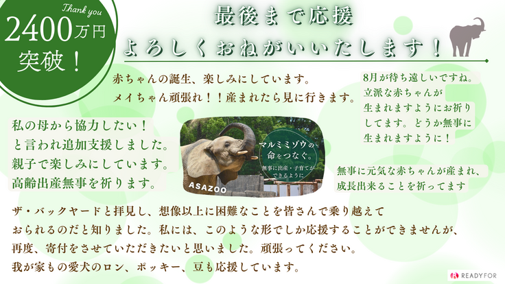 皆様からの応援コメントは全て読ませていただいています。メイへの応援、職員を気遣って下さる声、安佐動物公園の思い出など、多くの皆様の声に励まされると同時に、これだけの方が気にかけてくださる動物を飼育している責任も感じています。多くの方に応援いただいていると実感できたことも、今回のクラウドファンディングに挑戦した成果だと考えています。