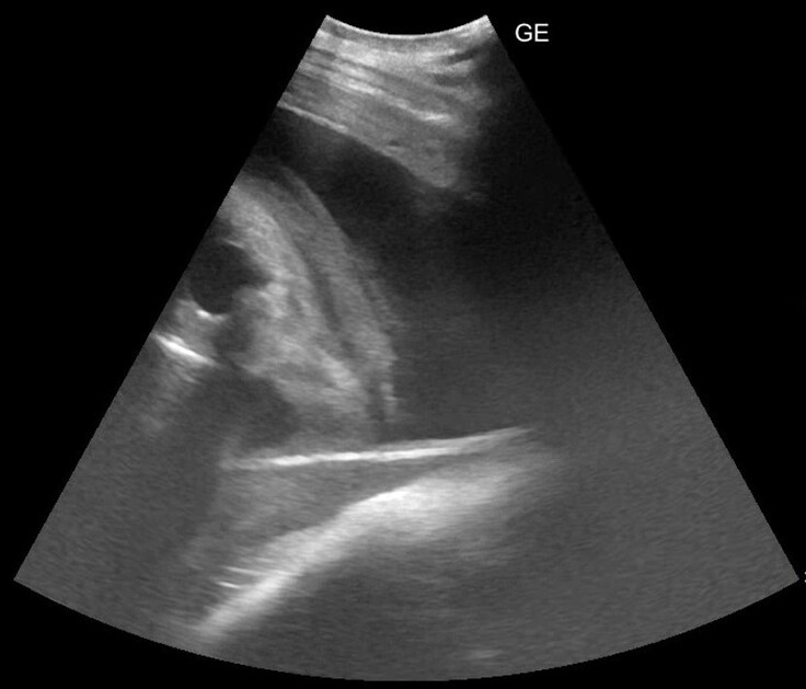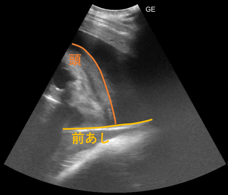 最初の画像と見比べていただくと、何となく見えてくるでしょうか。メイのお腹の中の子ゾウの前肢と頭です。目に見える黒い部分が、目なのか、鼻の奥を捉えることができたのかははっきりせず、今後の検査で姿勢があえば追っていく予定です。