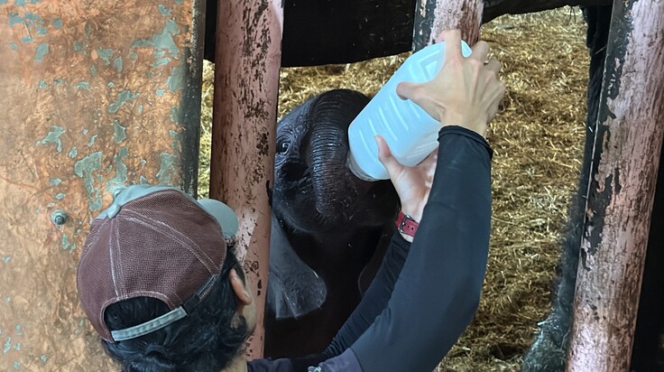 そのため、出産前に定期的に採取していたメイの血漿(血液の液体成分で、初乳にも含まれる抗体が豊富)を出産日の夕方から与えました。続いて牛用の初乳製剤を与え、現在はゾウ用人工ミルクをおよそ3時間おきに給与し、職員が介添えを行いながら、赤ちゃんの成長を見守っています。