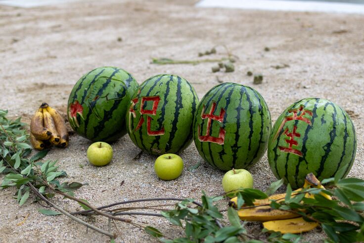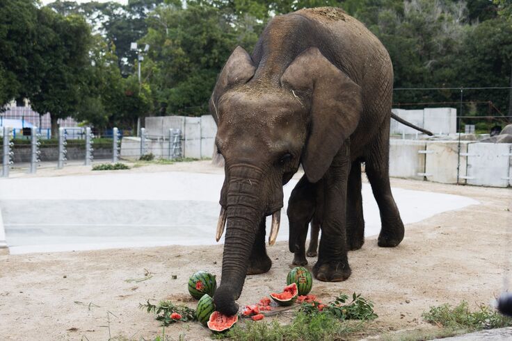 メイは食べ慣れないものはあまり好まないゾウです。普段はなかなか餌に使うことはできないものの、頂き物で食べたことのあるスイカを選ばせていただきました。練習中の展示場にセットして準備完了です。