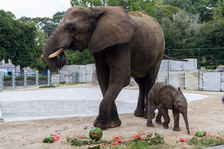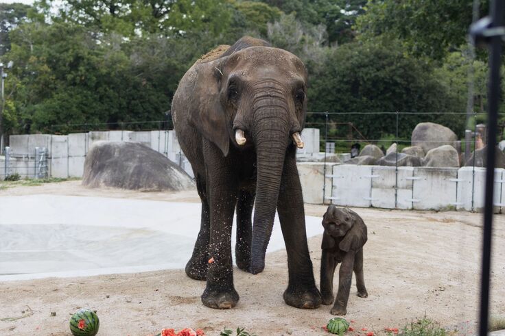 生後1か月となった子ゾウは、元気に成長しています。メイの真似をして口に木の葉を入れてみたり、メイが堀った地面に頭を入れてみたりと、いろいろなことに興味を持ちだしました。