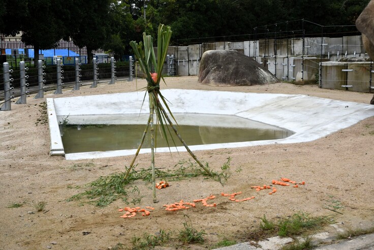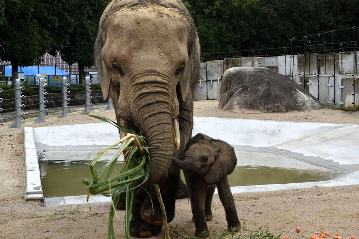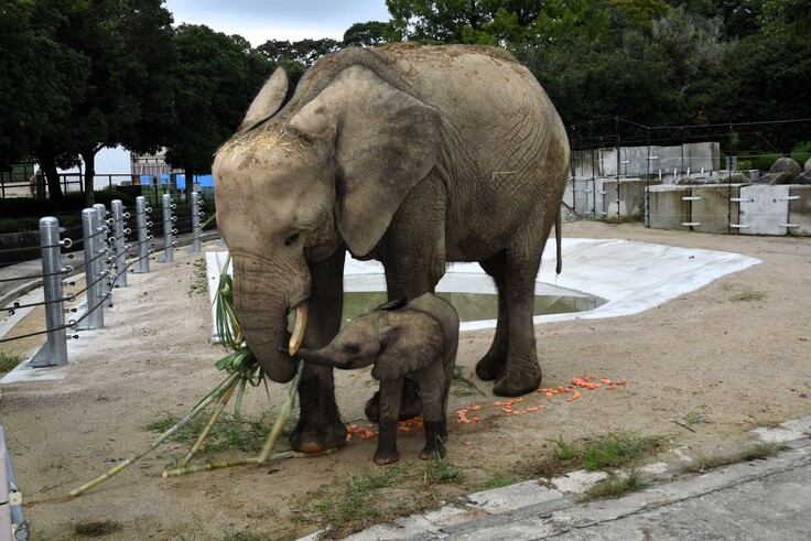 肢と鼻をつかって折りながら食べてくれました。メイが食べているものが気になるのか、子どもがメイの口に鼻を伸ばすのは時々見られる行動です。