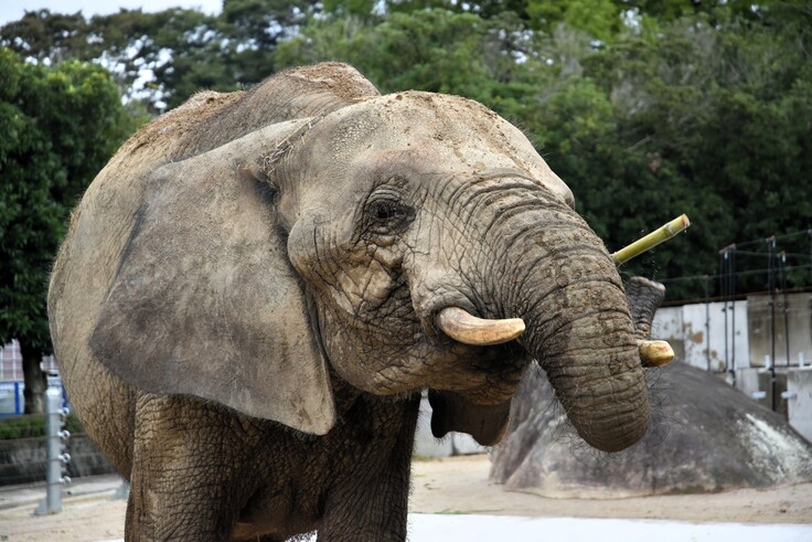 最後は、いつも木の枝でやっているように、鼻と牙で運びながら食べていました。