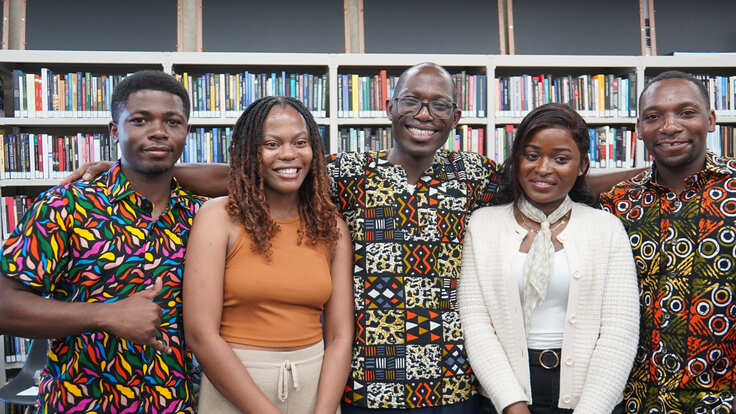 写真:招へい研究者のチャールズ・ピレンペ先生を囲む留学生たち(2024年10月)。左からポール、アネット、ピレンペ先生、ヴェルジアンヌ、ジャト