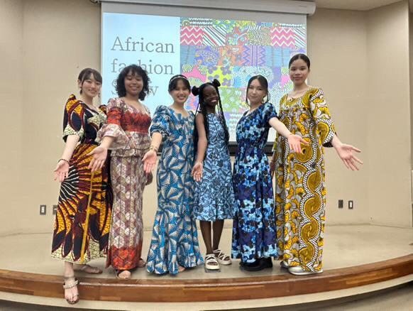 6月にTUFSにて開催されましたAfricanWeeks2025最終日にモデルとして参加したリンダさんとダニエルさん。他の留学生も多数参加。みなさん、素敵なアフリカ民族衣装ですね。