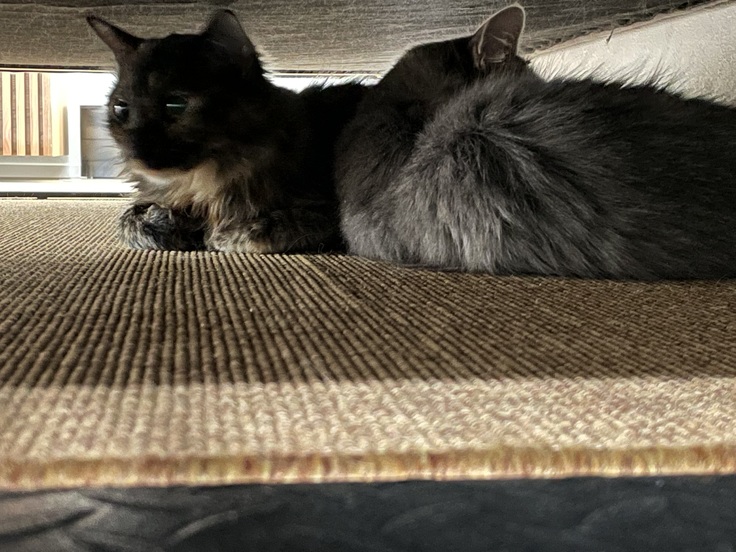 帰ってきたらステラはソファの下にずっと隠れていました。途中からアッシュも心配なのか寄り添ってました。