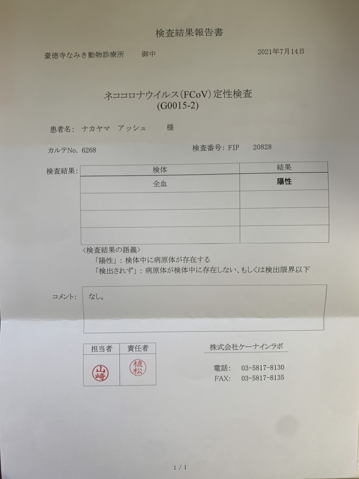 そのあとに、7月14日に猫コロナウイルス陽性の診断がされて、