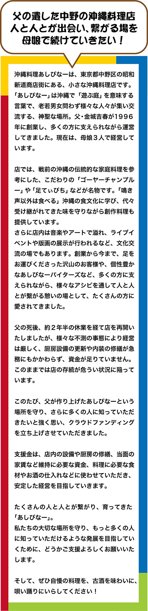 そして、このプロジェクトを立ち上げてからここまで本当に沢山の方に助けていただきました。父が亡くなってもなお、あしびなーを愛し、私たち家族を支えてくださり本当にありがとうございます。