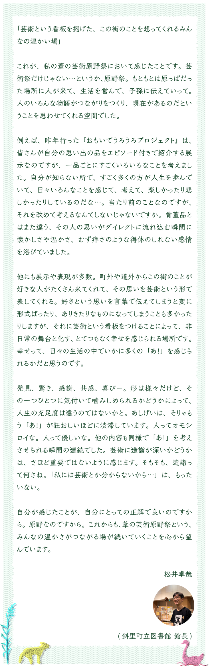 このあしげいという活動は、過去も現在も未来も手放さないでこの土地で生きていく文化活動の可能性を追求するためであり、そこに向けて継続するべきだという手応えがあります。