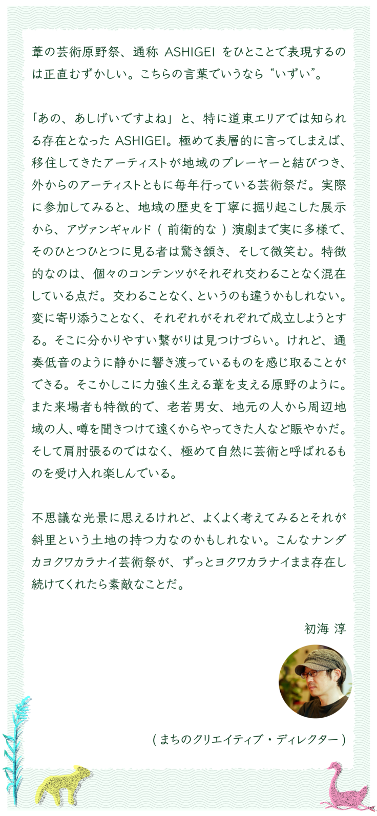 私たちはこの芸術祭で、多義的な意味合いを持つ「葦」の原を逍遥し、芸術という「想像力の原野」を育てていくことを目指します。