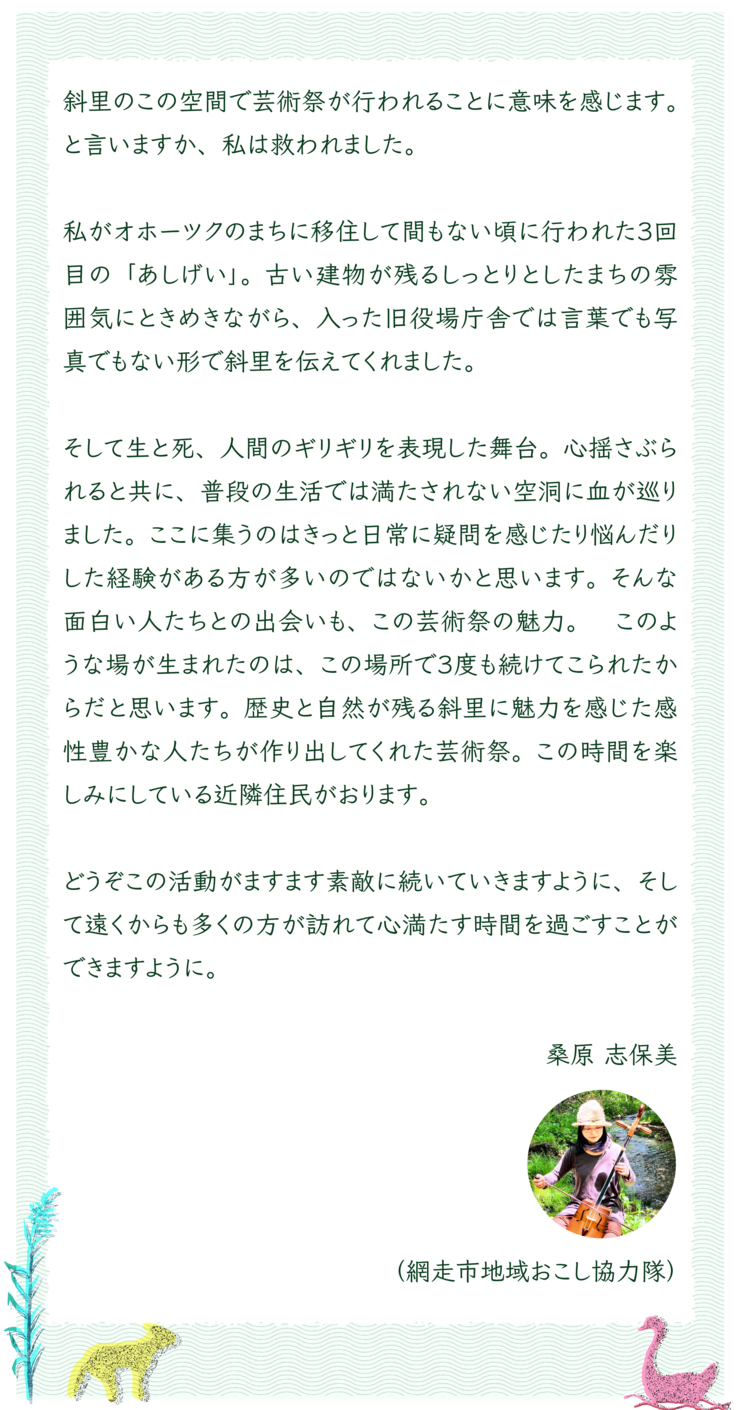 本芸術祭では、上記の理念のもとで斜里町内外の表現者と地域住民が垣根を越えて企画と運営、創作と発表を一体的に行います。