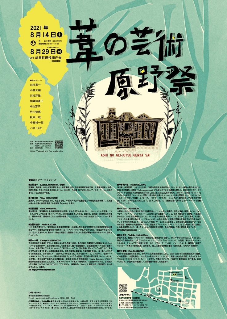 多くの企画展やイベントが開催中止という選択を迫られてきた昨今、私たちは関係各所と連携を深め、感染防止対策を調整し、葦の芸術原野祭を開催することを決意しています。しかし、この判断は日々変化する状況に応じて変化するものであり、私たちは延期や中止のリスクを受け入れながら、しなやかで根気強い表現活動を絶やすことなく、発表の場を実現するための取り組みを続けています。