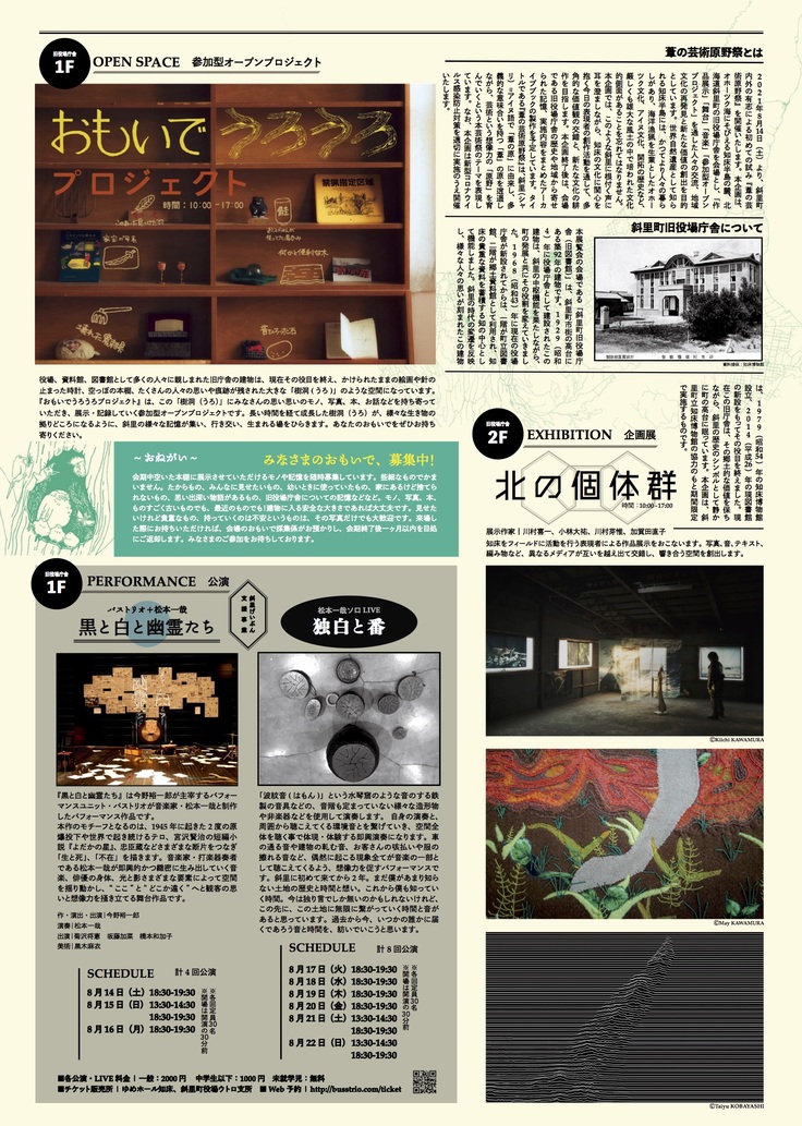 また、本芸術祭終了後にはアーカイブブックの制作をおこないたいと考えています。多くの人々に愛されてきたこの場所と、そこに持ち寄られた記憶、その場で起こった出来事を一冊の本に編むことで、旧役場庁舎の過去と現在を残し、みなさまに伝えます。