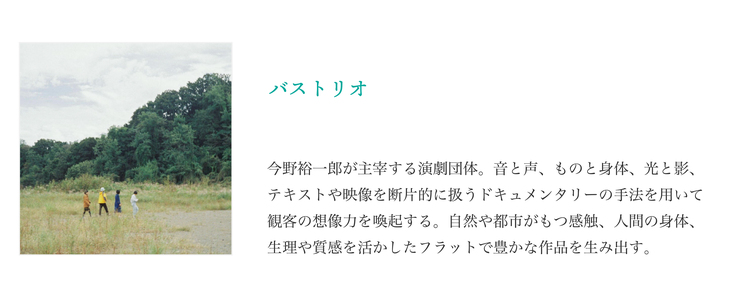 今野裕一郎が主宰するパフォーマンスユニット、バストリオによるパフォーマンス。さまざまな要素によって空間を揺り動かし、“ここ”と“どこか遠く”へと観客の思いと想像力を掻き立てる舞台作品です。