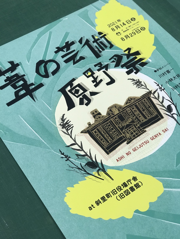 まず、芸術祭のテーマカラーは「緑」です。緑といっても色々あり、、、、斜里町の夏季の爽やかな緑色を、チラシに落とし込みました。チラシは並べて貼るとウロのある木が並んでいるようなイメージでデザインしています。葉っぱのかたちなどのディテールは水楢の木を参考にしました。このチラシは斜里町内の新聞にも折り込まれました!