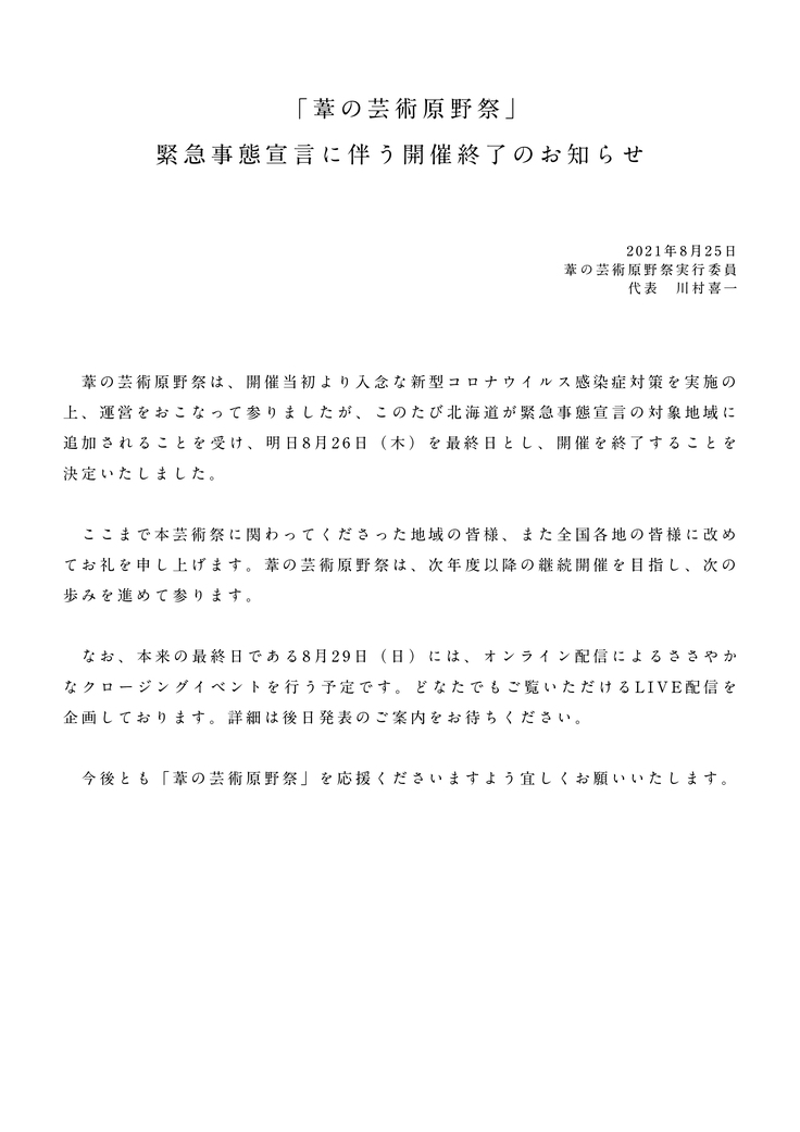 「葦の芸術原野祭」は北海道における緊急事態宣言が8月27日(金)から発令されることを受け、本来であれば8月29日(日)までの会期であるところ、急遽8月26日(木)を最終日とする運びとなりました。