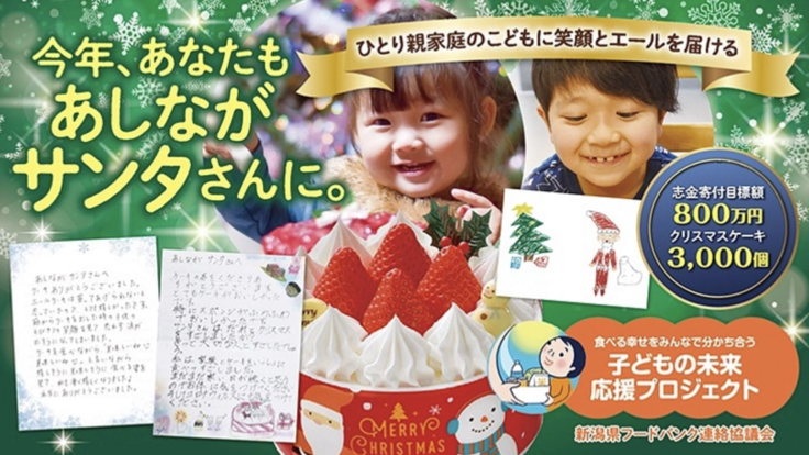 そこで当会では今年度も、厳しい生活環境にある新潟県内のひとり親家庭の子どもたちに、クリスマスのひと時に家族団らんを彩るクリスマスケーキを贈ることで、あしながサンタさんからのエール(皆様からのご寄付)を取り次ぎ、子どもや家族に笑顔を届けるとともに、人とのつながりや未来への希望を感じられる社会づくりに寄与して参りたいと考えています。