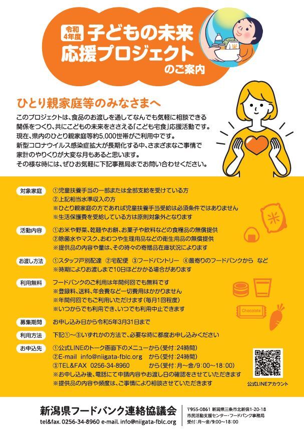 2020年4月に発足。同月にコロナ禍で生活に困難さを抱えたひとり親家庭への食品や衛生用品の緊急支援を行うために『新型コロナ緊急対策 子どもの未来応援プロジェクト』をスタート。今日まで継続的に、行政や社協、母子連や子ども食堂など、多様な組織と連携するフードバンクの活動基盤を軸に"子どもの貧困"対策に取り組んでいます。