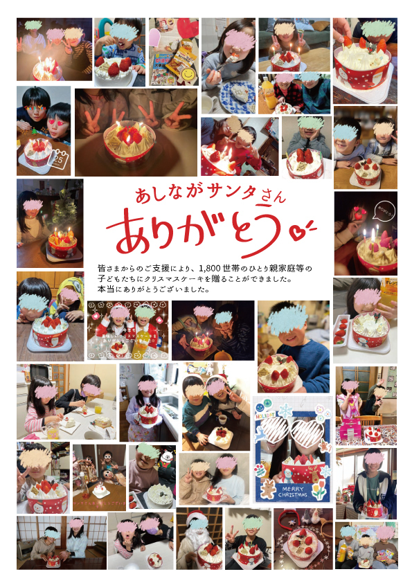 2020年度、2021年度、2022年度と『あしながサンタX’masプロジェクト』3回のクラウドファンディングを実施し、全国よりたいへん多くの皆さまからご支援をいただくことができ、毎年2,000世帯を超えるひとり親家庭の子どもたちにクリスマスケーキを贈ることができました。本当にありがとうございました。