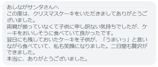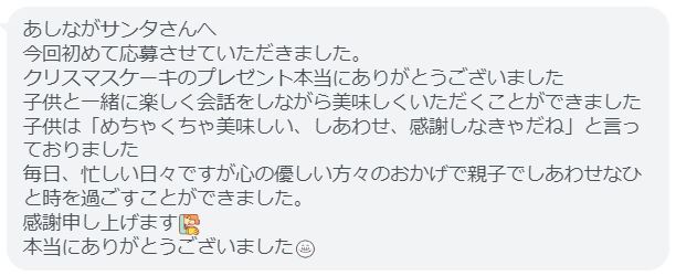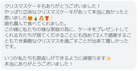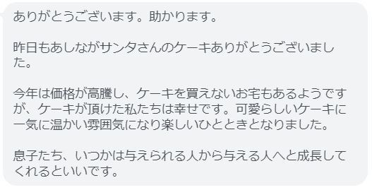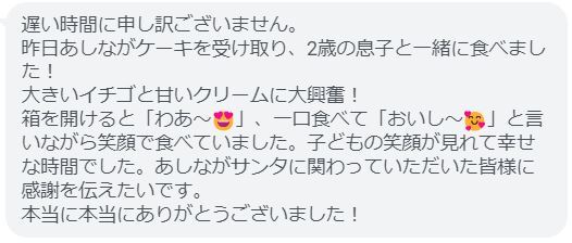 前回も、あしながサンタさんからクリスマスプレゼントを受け取られたご家庭からは、多くの丁寧な感謝のメッセージやケーキを囲んだ素敵な写真が寄せられました。