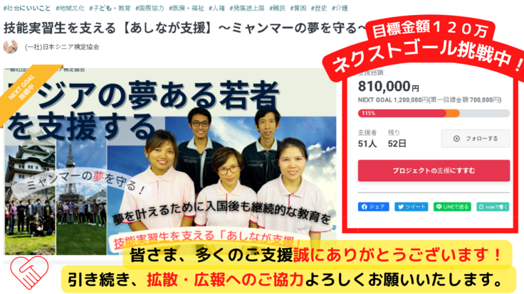 目標金額120万を目指し、ネクストゴールを設定いたしました。