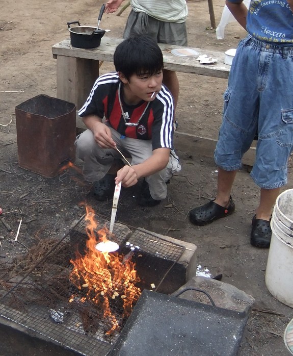 最後の極めつけはそのおたまに水を入れ又、焚き火にかざす。お湯になり おたまが綺麗になり、これで最後の後始末をしてしまった。