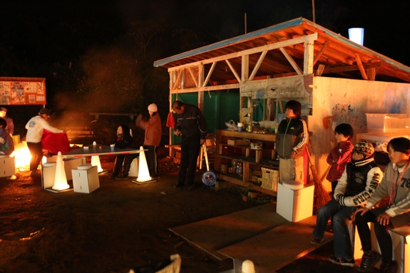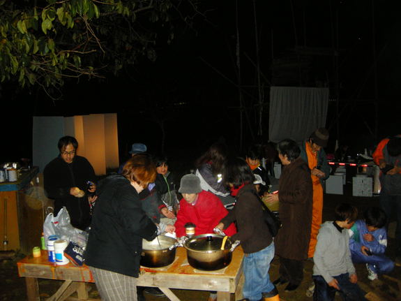 ゆっくりクリームスープを飲んで焚き火で暖まる人。影絵で遊ぶ子ども。いつも通り秘密基地でくつろいでたり工作やってたり。小屋の上から眺めたり。スクリーンの後ろで何人かでたまって逆から見たり。雑談したり。