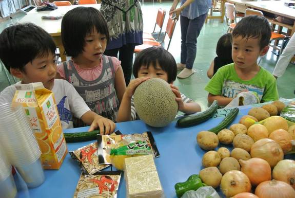 持ってきた野菜や果物、食べ物を集めます!すぐに仲良くなる子ども達☆