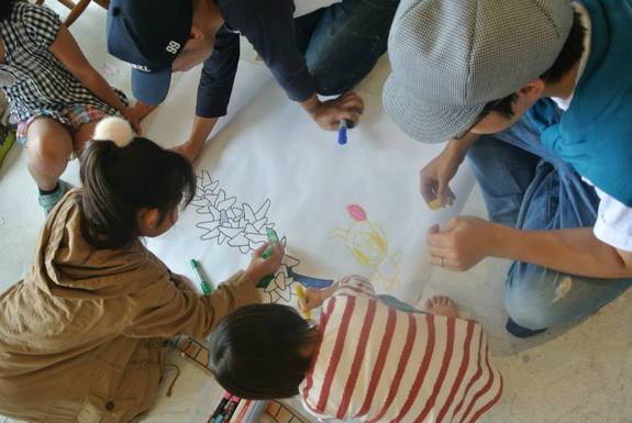 線で描く素敵な絵にみんなで色を塗ったり、横に絵を描いたり。自由に表現!!