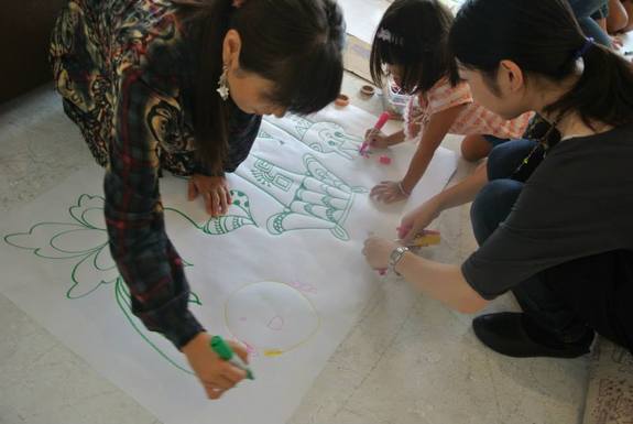 こちらもかわいいイラストに色を塗ったり、テープを貼ったり。そして、毛糸や輪ゴムで指輪やネックレスなどもつくってくださり、女の子に大人気でした!