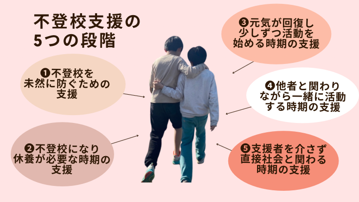 「不登校支援」は一括りにされてしまいがちですが、大きく分けると5つの段階に分けることができます。