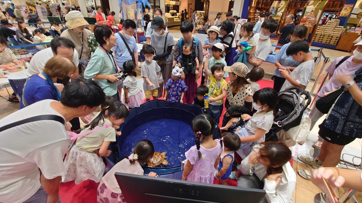 オープンと同時にたくさんの方がビオロボットのウミガメちゃんたちとふれあいにあそびに来てくださいました!