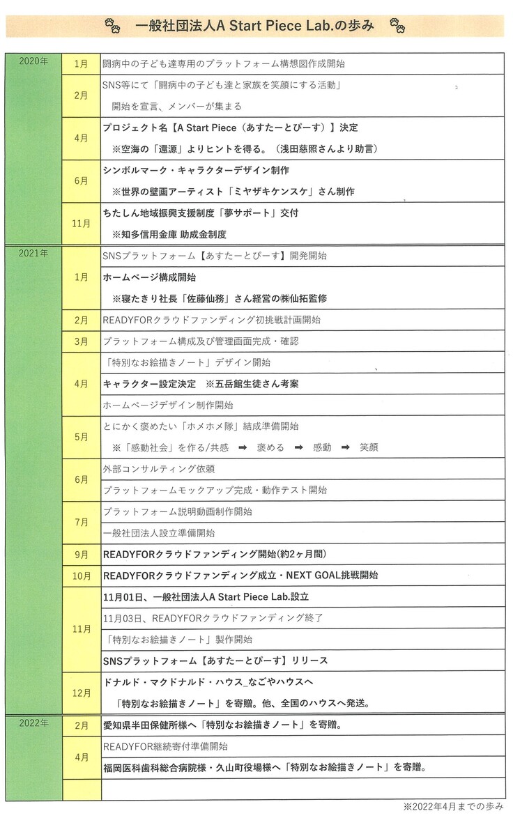 闘病中の子ども達と家族を笑顔にする活動として、闘病中の子ども達専用のSNSプラットフォーム【あすたーとぴーす】を開発。【あすたーとぴーす】に関連したお絵描きノートを製作しドナルドマクドナルドハウスへ寄贈。お絵描きノートの資金はREADYFORクラウドファンディングにて調達。現在、闘病中の子ども達へお絵描きノートを配布し、【あすたーとぴーす】の入会促進を実施中。