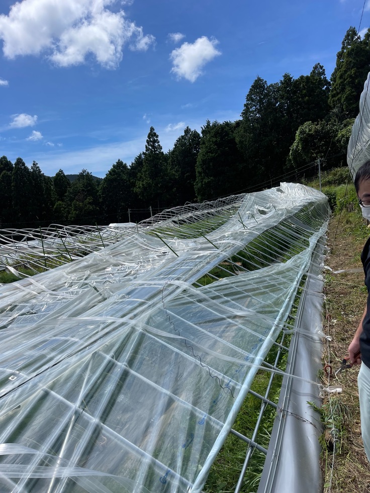 2022年9月。順風満帆に感じていた僕の農業は、一夜にして、絶望の淵に突き落とされました。台風11号の上陸です。前述したように、アスパラガスは雨に弱い植物です。台風の雨から守ろうと、ビニールを外す方法ではなく、閉め切って台風に備えていたことが裏目に出てしまいました。拭き下ろしが強い段々畑ということもあり、ビニールハウスのパイプが崩れ、ビニールはめくれ上がり、アスパラガスのほとんどが野ざらしになっていました。就農後はじめての台風ということもあり、対策がきちんと取れていなかったのかもしれません。