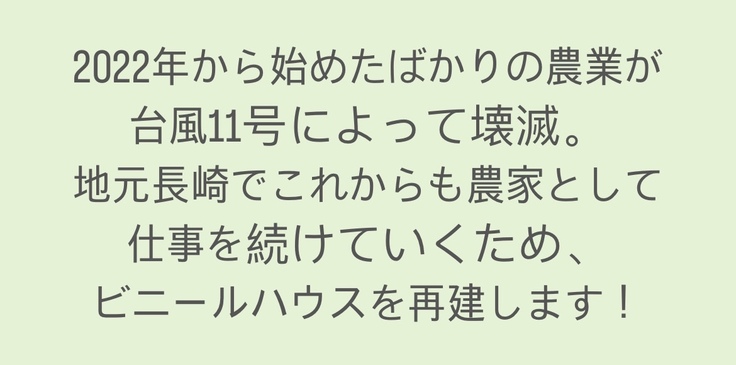 2022年春より故郷である対馬で新規就農して、アスパラガスを作っています24歳です。2022年9月の台風11号の甚大な被害により、ビニールハウス5棟全てが倒壊。少しでも早くみなさまのところへ美味しいアスパラガスをお届けしたくプロジェクトへの参加を決意しました。