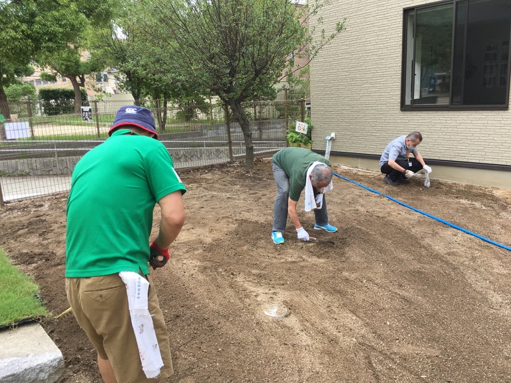 今後は、芝生が根付くまで朝晩の水やり、9月ごろに冬柴の種を蒔きます。