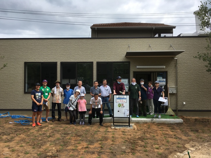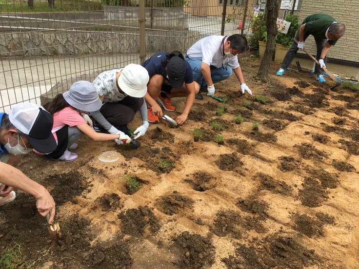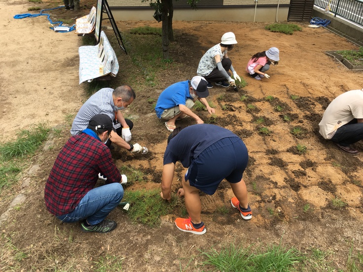 6/20(土)午後に『鳥取方式』の芝生専門家、小寺さんの指導のもと大人14名、子供2名で2時間程度で1㎡に6~8株の芝生(ポット状)を植え込み、しっかり根を足等で踏み、土をかけて出来上がりとなりました。