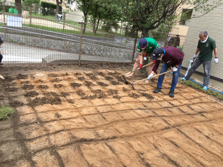 また、芝生を植え付ける前に土壌改良が必要との園芸家のお話しもお聞きして神戸市さんとご相談し6/16(水)に70㎡の植え付け場所を深さ5cm程度、芝生が育つに最適の土に入れ替えました。