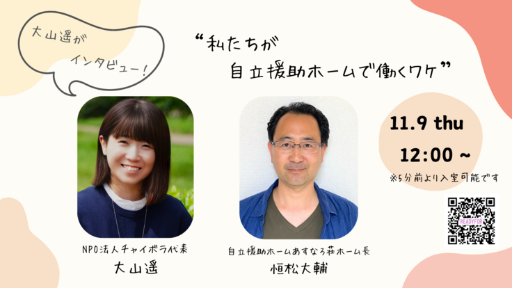 児童養護施設等の人材確保や人材育成を行っているNPO法人チャイボラの代表の大山遥さんをお招きして、”私たちが自立援助ホームで働くワケ”をインタビューしていただきます。 数ある福祉業界の中でどうして『自立援助ホーム』なのか。 いろいろな思いとともにお話させていただきたいと思います。