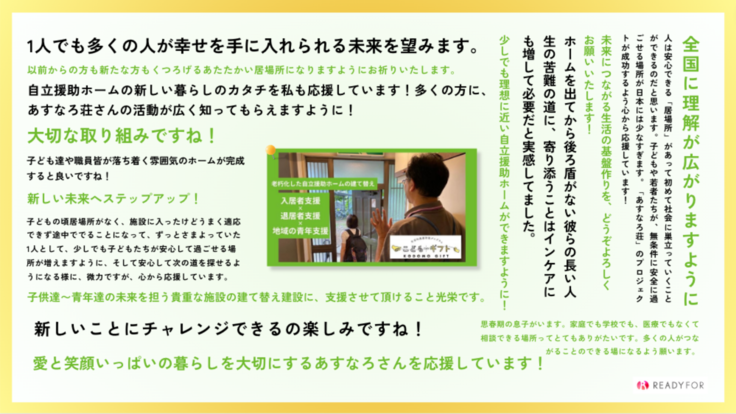 途中で不安に襲われることもありましたが、ご支援いただいた方々からの温かいメッセージや、メールやSNS、チラシで多くの方に声をかけていただいたりと皆様が応援してくださったおかげで、達成するかどうか以上にネクストゴールに向かうまでになりました。