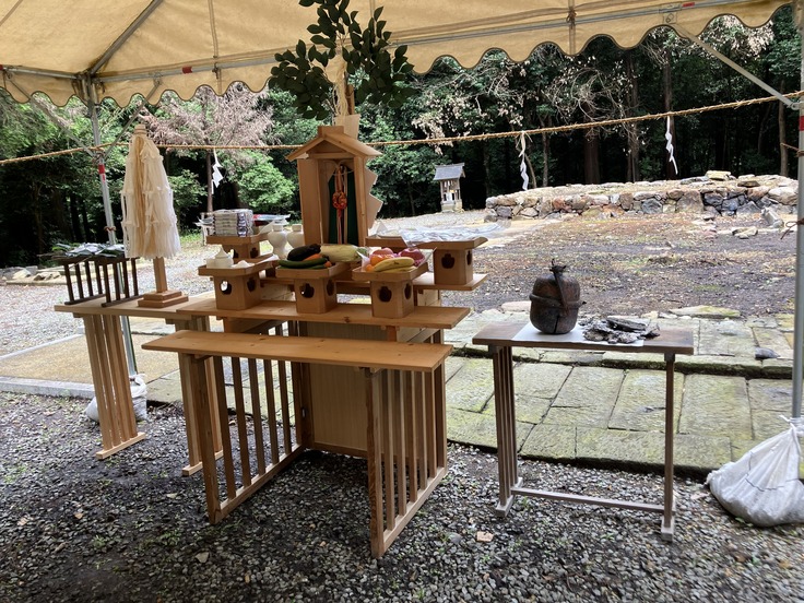 神籬(ひもろぎ)の中の祭壇の様子、右に見えるのが焼け残った鈴など