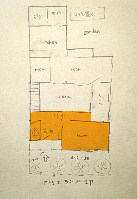 ↓の見取り図のオレンジ色の部分が床の張り替えの終わった場所です。