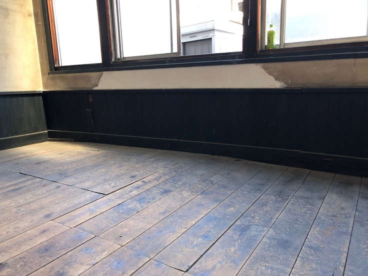 床を剥がす前。左奥に板を張って、隙間を塞いでいました。緩やかに斜めになっています。この一部は床下収納になっていて、彫刻制作に必要な「粘土蔵」になっています。