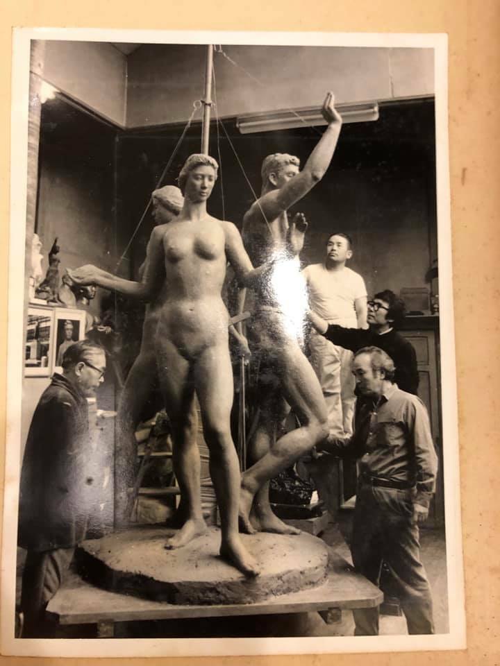 昭和31年頃。池袋駅西口ロータリーに設置されていた「希望の像」制作中の祖父(右下)。 4人の共同制作でした。像は、すでに撤去され、破損がひどく現存しないようです。
