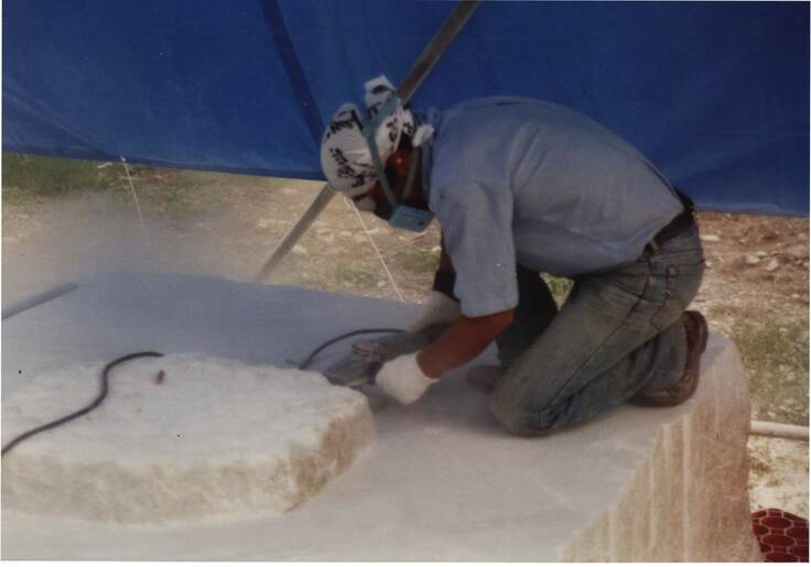 平成5年。第5回佐久大理石シンポジウムに参加して、石を相手に制作中の父。この作品は佐久市川上村樋澤579周辺に設置されています。(Googleストリートビューで見れます)
