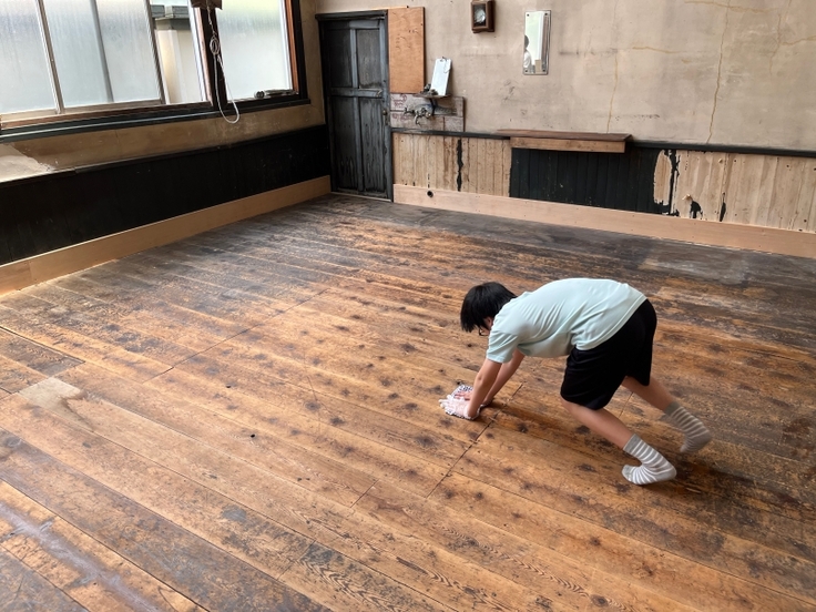 小学校かお寺のような感じで、雑巾掛けをしました。
